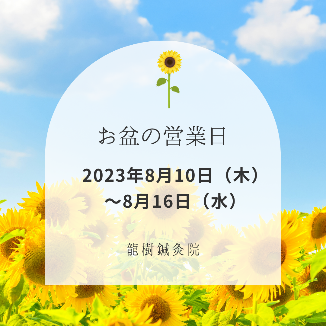 龍樹鍼灸院は、お盆期間8月10日(木)〜16日(水)も営業いたします。