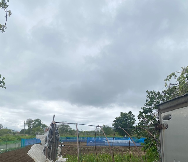 ビニールハウスの骨組みをフックバンドで止める作業をしましたが、天気はあいにくの暴風雨。大きなポプラの木が風に揺られてゴォーゴォーと音を立てています。